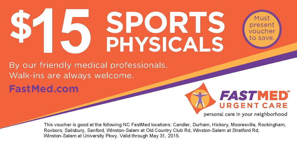 Need a sports physical? FastMed has discounted sports physicals now through May 31st in Durham. A printed copy of the attached voucher is required to receive the discount.