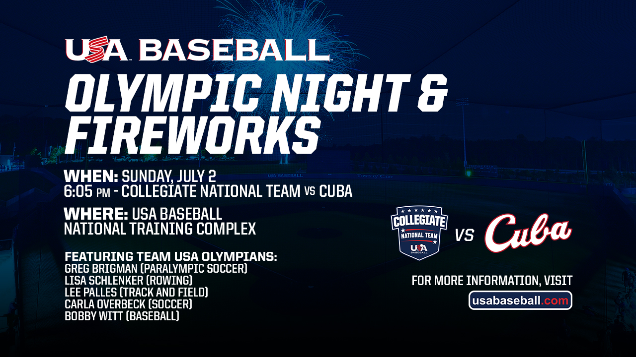 USA Baseball is having an Olympic Night event this weekend! The event will give fans the opportunity to get autographs from former and current Olympians, watch Team USA as they take on Cuba, hang out with local sports organizations in our Olympic Village, and end the night with glow sticks and a fireworks display!